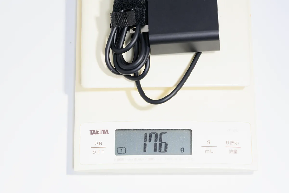 74Whの大容量バッテリーを搭載。AAAタイトルをパフォーマンスモードで動かしても、実用的な駆動時間を確保しています。付属の65Wアダプターも176gと軽量で、持ち運びの負担になりません。