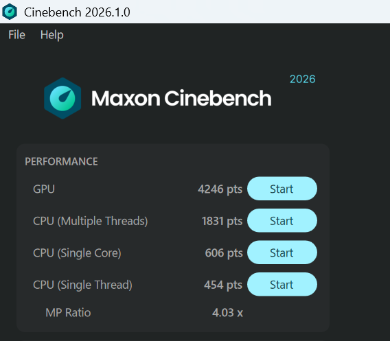 | Cinebench 2024 / 2026 | GPU | 4246 pts |