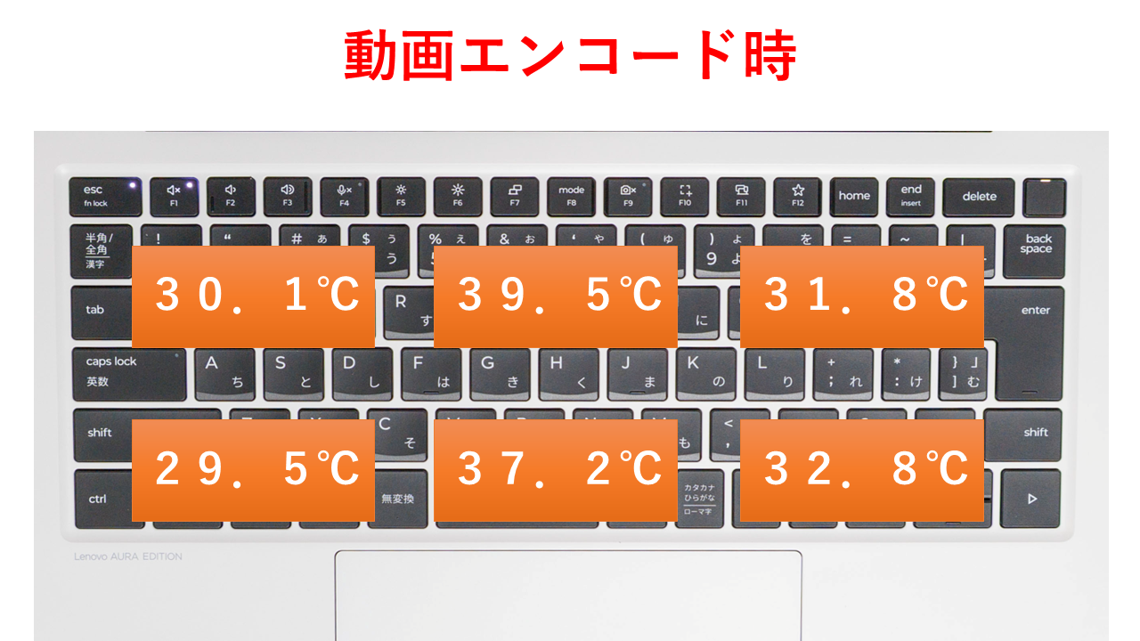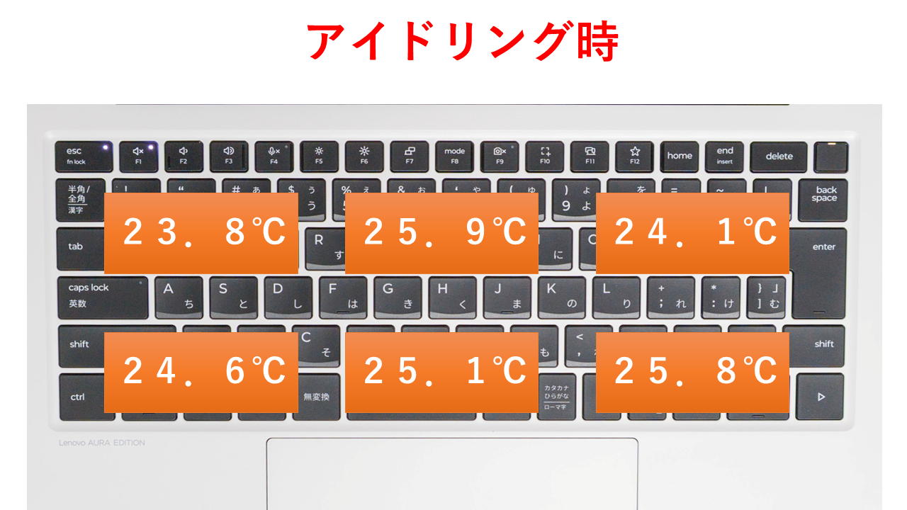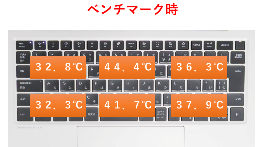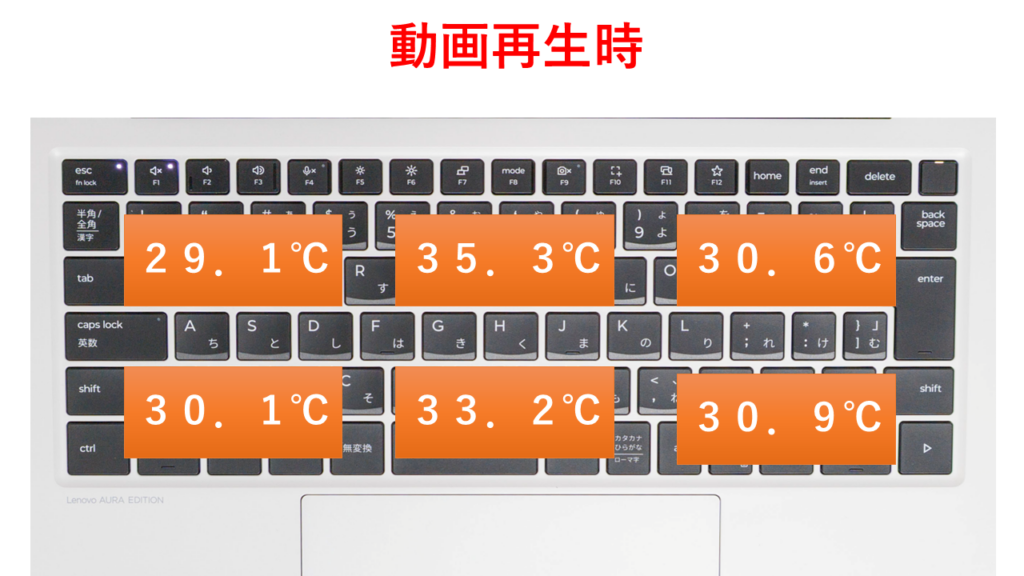 温度はノートPCとしては温度は少し高いレベルのイメージですね。