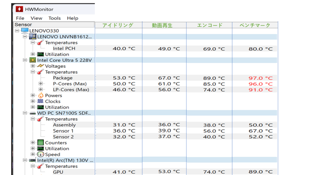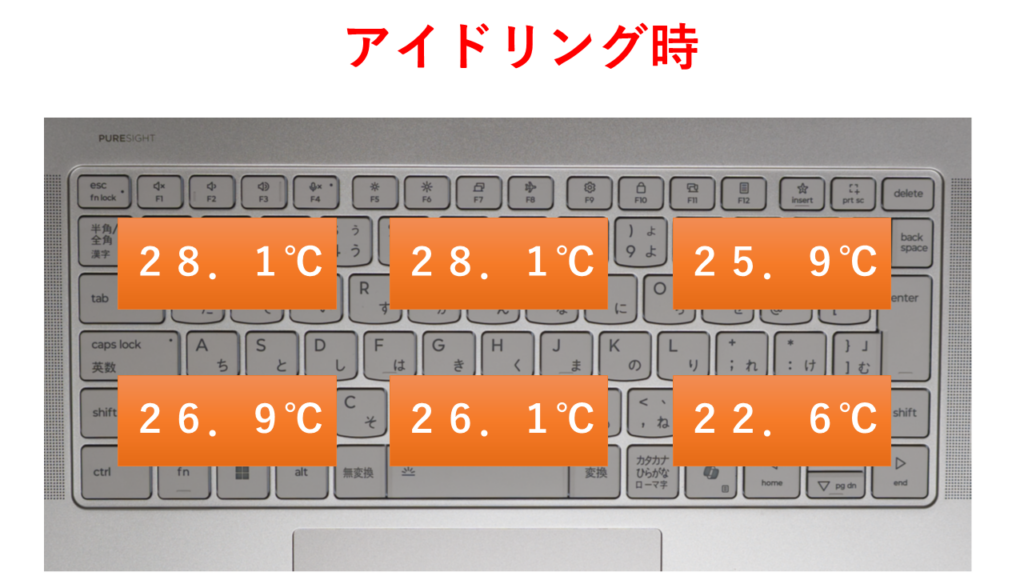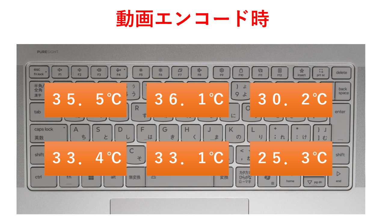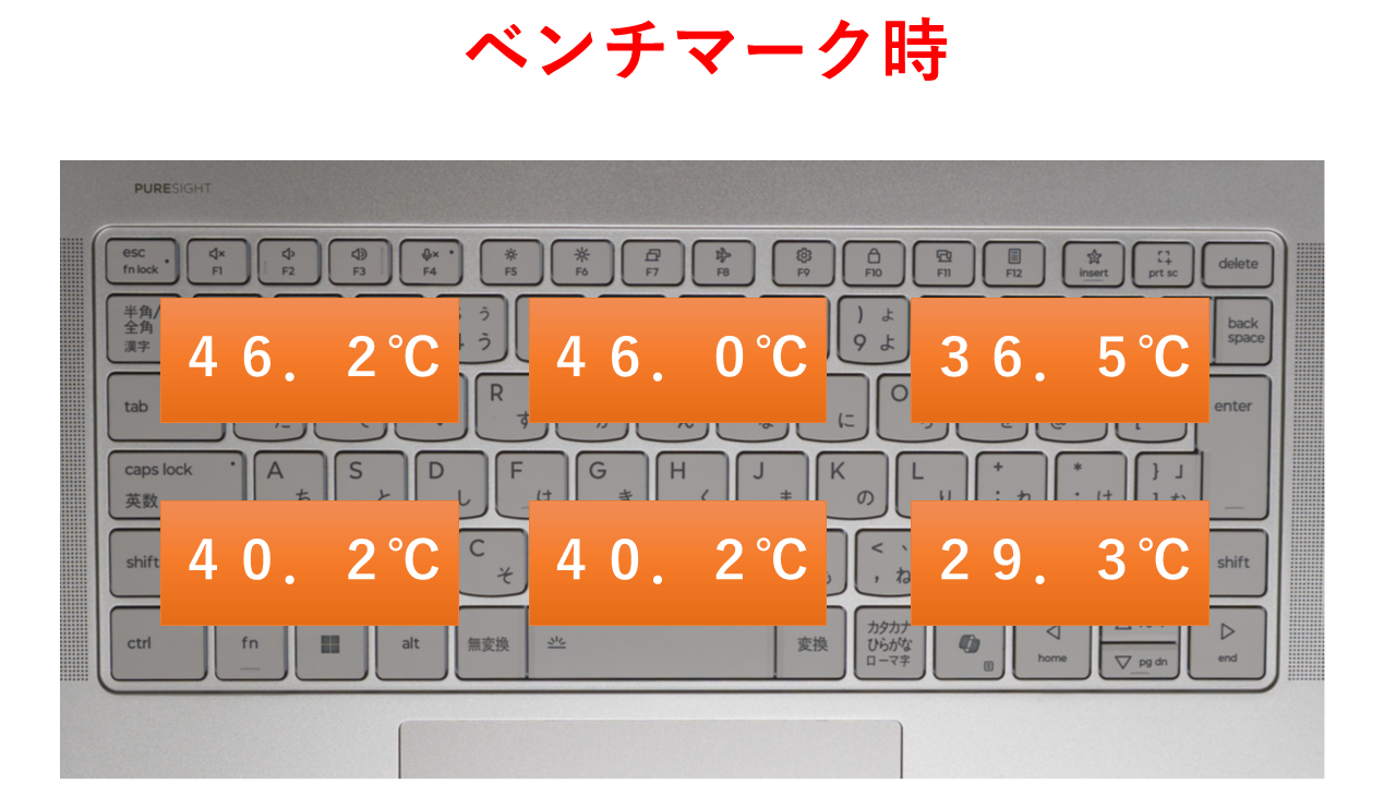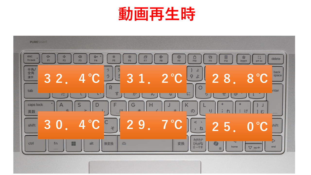 温度はノートPCとしては温度は少し高いレベルのイメージですね。